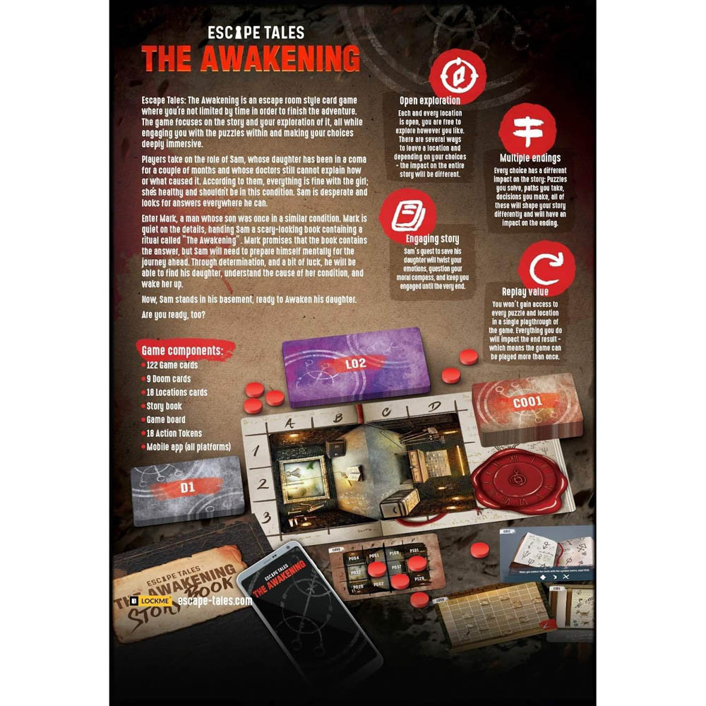 Escape Tales: The Awakening είναι ένα παιχνίδι καρτών δωματίου απόδρασης, όπου οι παίκτες αναλαμβάνουν το ρόλο του Σαμ, που προσπαθεί να ξυπνήσει την κόρη του από ένα μυστηριώδες κώμα. Με εκπληκτική αφήγηση, εξερεύνηση χωρίς χρονικούς περιορισμούς και δύσκολες επιλογές, το παιχνίδι προσφέρει μια συναρπαστική εμπειρία. Ο Σαμ πρέπει να ακολουθήσει μια τελετουργία που ονομάζεται “Το Ξύπνημα” για να ανακαλύψει την αιτία του κώματος της κόρης του. Με απρόβλεπτες πλοκές και πολλές εκπλήξεις, το παιχνίδι υπόσχεται μια συναρπαστική περιπέτεια στον κόσμο του μυστηρίου και της ανακάλυψης.
