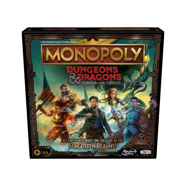Το Monopoly Dungeons & Dragons: Honor Among Thieves είναι μια συναρπαστική εκδοχή του κλασικού Monopoly, εμπνευσμένη από την ταινία με τον ίδιο τίτλο! Οι παίκτες επιλέγουν τον χαρακτήρα τους και ξεκινούν την περιπέτειά τους, αναζητώντας αντικείμενα και θησαυρούς ενώ εξασφαλίζουν τις τοποθεσίες με το ζάρι. Προσοχή στα τέρατα και τους μοχθηρούς Red Wizards! Ο νικητής είναι αυτός που θα καταλήξει με τον μεγαλύτερο θησαυρό αφού εξασφαλίσει όλες τις τοποθεσίες! Γλώσσα: Αγγλικά