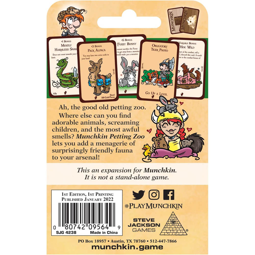 Πού αλλού μπορείς να βρεις αξιαγάπητα ζώα, φωνάζοντα παιδιά και τις πιο άσχημες μυρωδιές; Το Munchkin Petting Zoo σας επιτρέπει να προσθέσετε μια ποικιλία απροσδόκητα φιλικών ζώων στο αποθεματικό σας! Μάλλον θα θέλετε να πλύνετε τα χέρια σας μετά το παιχνίδι αυτών των 30 ολοκαίνουργιων καρτών για το Munchkin παιχνίδι σας