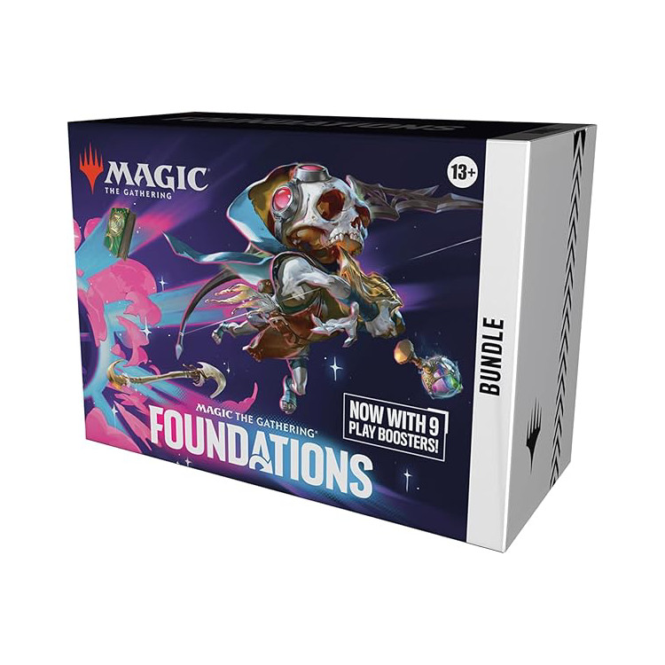 Το κάθε Foundations Bundle περιέχει 9 Boosters, μία exclusive foil promo κάρτα, 40 basic lands (20 foil & 20 nonfoil), 1 Spindown Life Counter Dice και ένα όμορφο κουτί αποθήκευσης.
